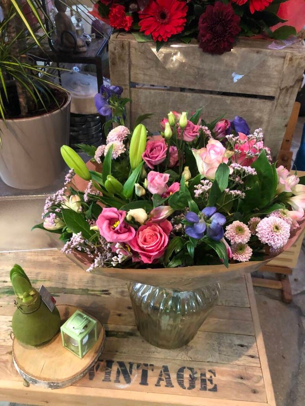 Boeket in licht roze tinten, met een hint van crèmekleurige roosjes. Een boeket dat zowel een klassieke als moderne toets heeft. Het boeket bestaat uit een groene basis.