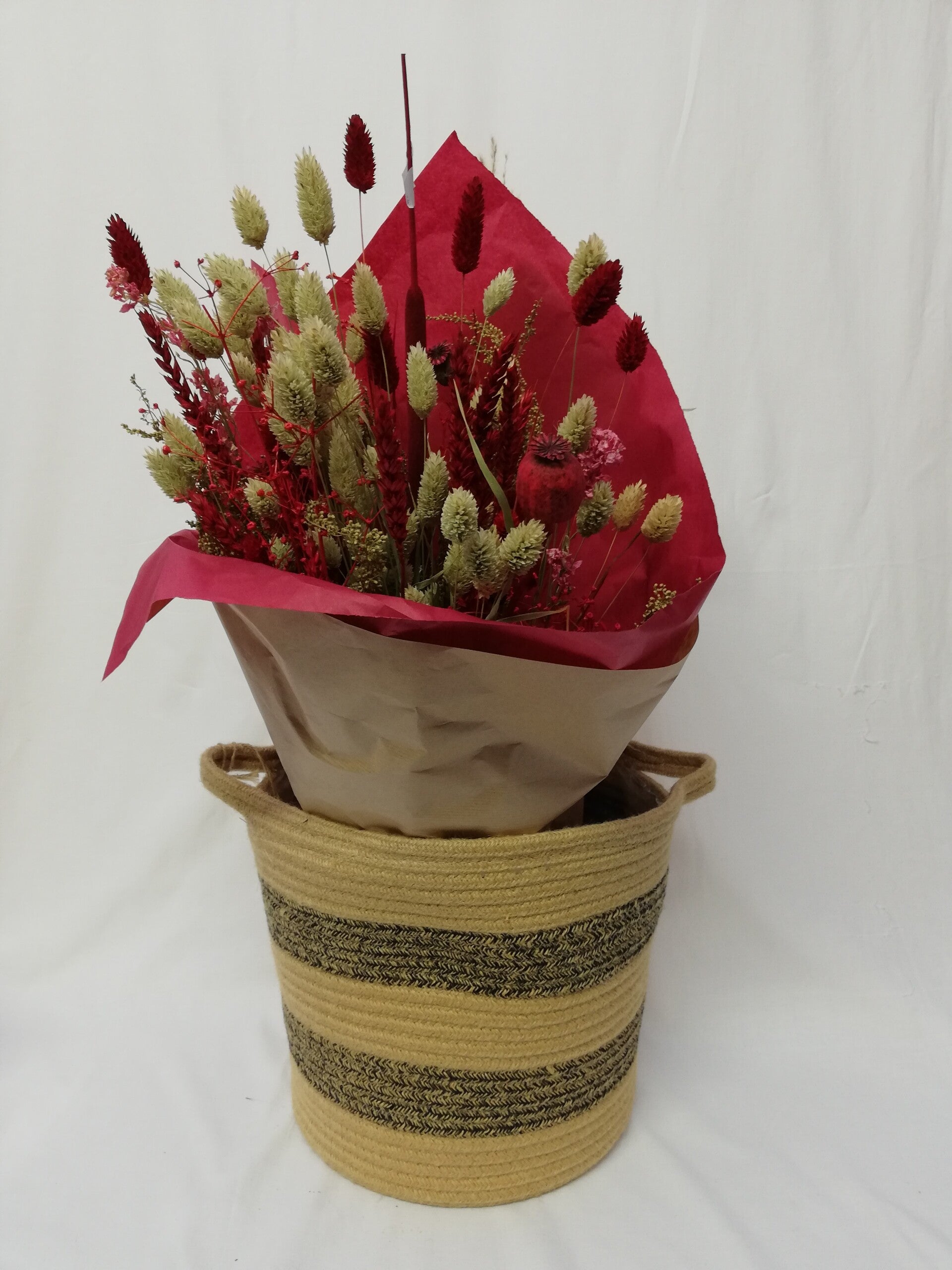 Droogboeket in rode en natuurlijke tinten. (zonder mand)